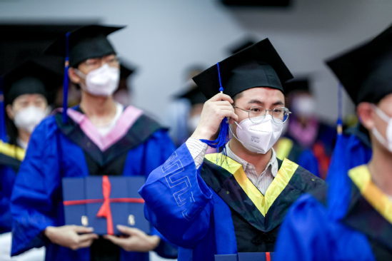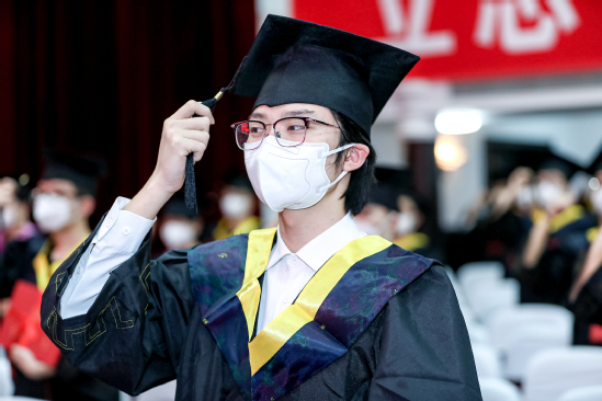 校友代表顾巍发言 今年由于疫情防控特殊原因,学位授予仪式环节采取无接触拨穗正冠。在校领导和导师的见证下,在悠扬的校歌声中,全体毕业生手持学位证书,完成了拨穗正冠仪式。云合影定格下他们人生中值得永远铭记的时刻,这一刻开始,他们将开启绚烂的新篇章,这一刻开始,他们将成为众多上理校友中最年轻、最鲜活的力量。