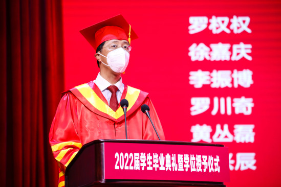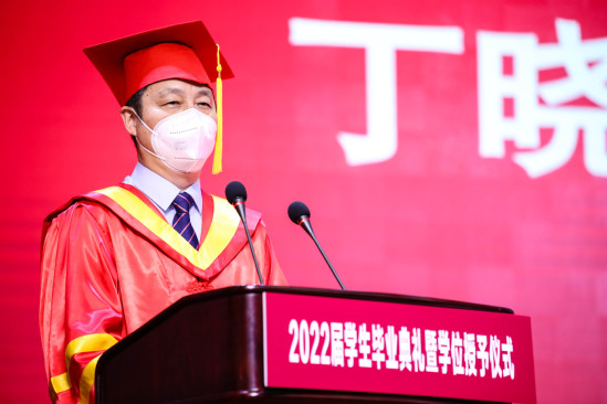 毕业生手持学位证书,完成拨穗正冠仪式 丁晓东做了题为《在开放式结局中自定义多彩未来》的致辞。在毕业生们即将开启“未完待续”的下一集人生之际,丁校长送给他们自定义未来的几个“必选项”:一是感恩,未来无论处于常态还是非常态,希望毕业生们抱有一颗感恩之心,时时以大局为重,多为别人着想、为集体着想,多一些理解,多一些宽容,让所有善良都得到温暖的回报;二是理性,希望毕业生们今后无论风平浪静或是险象环生,都始终头顶理性的光辉,善于全面、辩证、发展地看问题,保持独立的主张、强大的定力、恰当的分寸,不仅成为自己的主人,更成为给予他人正能量的“领袖”;三是信心,置身于“后奥密克戎时代”,不仅要认清现实,更须重拾信心,希望毕业生们攻破重重障碍去逐梦圆梦,在危中寻机,开辟建功立业的新蓝海。