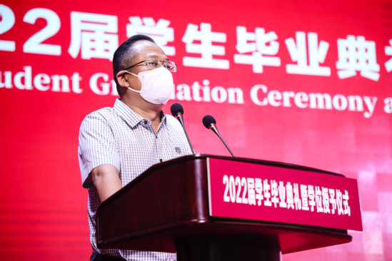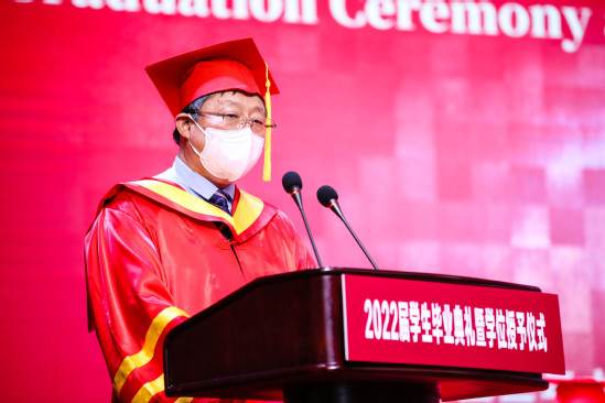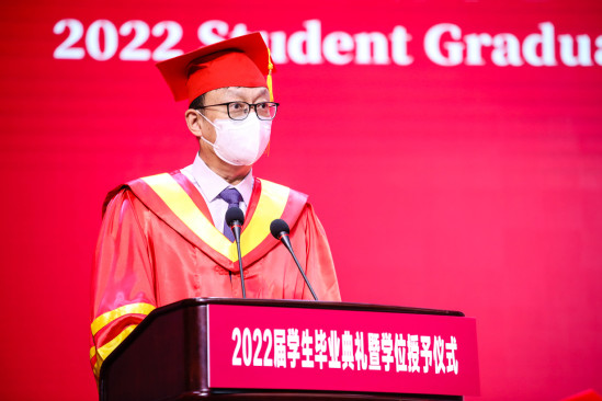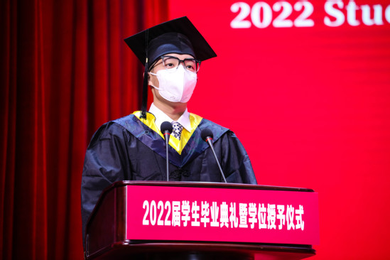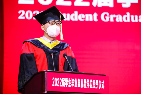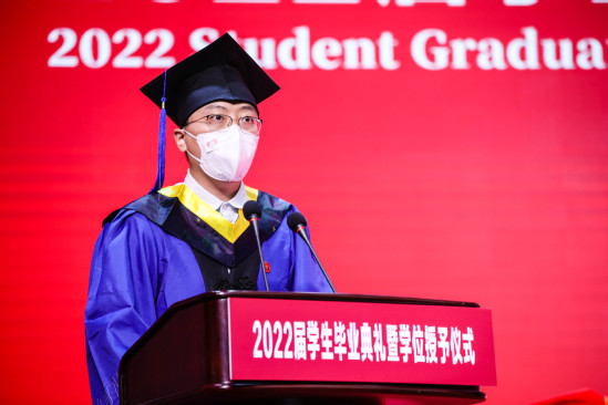 张华宣读《上海理工大学关于授予2022届本科毕业生学位的决定》 校园的每个角落,都留下了上理学子奋斗进取的足迹,毕业生代表与大家分享关于他们的成长故事和对青春最美好的回忆。健康科学与工程学院硕士毕业生平泽禹在发言中说,虽然疫情让毕业临行略显匆忙,但作为上理学子,已将“信义勤爱、思学志远”的校训融入每个人的精神内核,在母校不懈追求建设特色显著的一流理工科大学的同时,同样会为自己的梦想不懈努力。将赴上海交通大学继续深造的能源与动力工程学院本科毕业生华菁阳回顾了自己4年在上理的成长,慢慢懂得校训“信义勤爱”中的“爱”,即是自信自爱、关怀互爱的小爱,又是奉献之爱、担当之爱的大爱,更是投身社会、立足时代的民族之爱、家国之爱。环境与建筑学院饶平平教授作为教师代表发言,他希望同学们能在今后的人生中耐得住寂寞、学会在逆境中成长,敢于担当、即便在暗处也要发光发热,甘于奉献、让青春绽放在祖国需要的任何地方。最后,93届制冷系校友、上海励致设备工程有限公司董事长顾巍分享了他的人生经历与感悟,鼓励毕业生们在今年上海面临最大疫情挑战,各种经济数据不如预期的情况下,先就业再择业,通过自己不懈的努力与坚持,定会收获美好的未来。