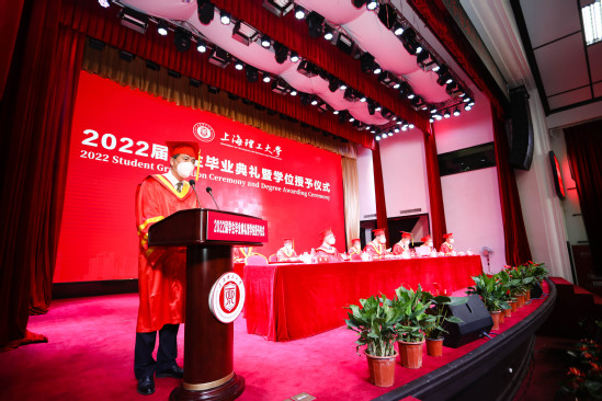 6月17日上午,上海理工大学2022届学生毕业典礼暨学位授予仪式在军工路校区大礼堂举办。本次活动在符合疫情防控要求的前提下,采取线下典礼+线上直播以及云合影的形式,主会场设置在大礼堂,未在校毕业生通过线上直播以及云合影方式同步参加典礼活动。 校党委书记吴坚勇,校长丁晓东,校学术委员会主任庄松林院士,校党委副书记刘道平,校党委副书记顾春华,副校长陈斌,副校长蔡永莲,副校长刘平,副校长张道方,总会计师赵明,副校长张华出席典礼。来自学校各职能部处、各学院负责人以及教师代表、毕业生代表、校友代表参加典礼。毕业典礼暨学位授予仪式由校党委副书记、副校长盛春主持。