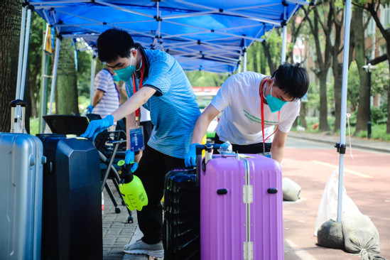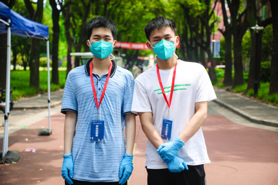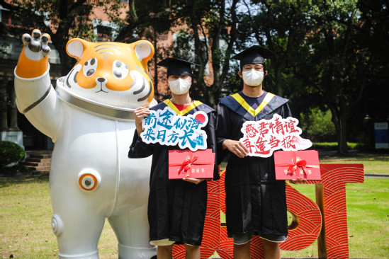 荣成东、李旺旺在校园里拍下毕业合影 站好毕业“最后一班岗” 也是一种满满的“仪式感” 毕业典礼当天,还有一些身在学校、原本可以坐在大礼堂参加线下毕业典礼的同学,然而他们却主动报名参与到当天的志愿服务岗位上,在各个校门口为安置行李的毕业生们进行入校检查、消毒等工作。 “由于校内人力有限,想到因为我的接力‘站岗’,能够让之前一直参与志愿工作的同学们参加现场仪式,同时也能为其他毕业生提供暖心的服务,这种身兼责任和使命的时刻也有一种毕业仪式感。”本科毕业生巫方志谈道。