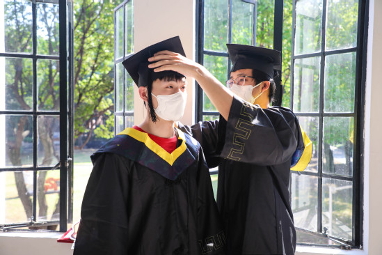荣成东为李旺旺戴学士帽 3天打包300多个包裹,往返位于7楼的宿舍上百次,日均2万步的记录,防护服被汗水糊在身上……这是荣成东和李旺旺毕业季最深的一段记忆,原本不熟悉的两个人,在毕业最后的日子里朝夕相处,收获了并肩作战的友情。“有时候遗憾也是一种历练,在校的时候有老师的守护,我们终究要展开自己的翅膀翱翔,这段经历困难的时间,让我们看到同学们、师生们之间最美好的一面,也在各方面得到成长。”李旺旺感言道。不仅收获了“线下”友情,“感谢老师和同学们的辛苦付出。”“线上”来自同学们感谢的话语也频频刷屏,让毕业季充满着温情。
