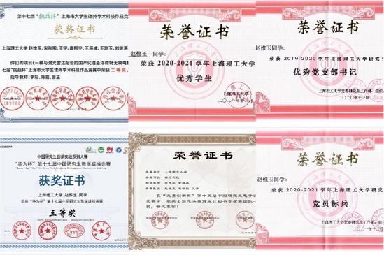 “叶声华奖学金”证书 “叶声华奖学金”是教育部高等学校仪器类专业教学指导委员会为鼓励仪器科学与技术学科在校研究生勤奋学习、刻苦钻研、勇于开拓、大胆创新,推进仪器科学与技术学科创新型人才培养而设立的。奖学金以天津大学教授、中国工程院院士叶声华的名字冠名。奖金用其所获2013年度天津市科技重大成就奖的全部奖金为基本金而设立,由天津大学北洋教育发展基金会负责管理,每年全国共10名仪器学科优秀学生获得该奖项。 坚守学生“本色” 自2019年入校以来,赵惟玉同学在导师高秀敏的指导下,参与多项校内外联合科研项目和创新创业竞赛。“民之从事,常于几成而败之。慎终如始,则无败事”,这是赵惟玉的座右铭。不论政治理论学习还是科学研究,从不是一蹴而就的,她每一步都稳扎稳打,才换来璀璨的光芒。她积极参加多项国家级科技竞赛,在“互联网+”、“挑战杯”、“研电赛”、“数学建模”等重大赛事中均获得国家级奖项。在IEEE SENSORS JOURNAL上发表论文一篇,软件导刊上发表论文一篇,光学仪器上发表论文两篇,申请软著1项、实用新型专利6项,均已授权。在校期间获上海理工大学一等奖学金多次以及研究生国家奖学金,并获优秀学生、党员标兵、优秀团员标兵、优秀党支部书记、校级与上海市优秀毕业生等荣誉。
