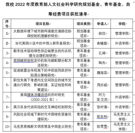 近日,教育部社会科学司公示了2022年度教育部人文社会科学研究一般项目评审结果,上海理工大学获批10项,其中规划基金项目2项、青年基金项目8项。项目立项数创历史新高,同比增长42.9%,位居上海市属高校第二位。 作为一所以工学为主、多学科协调发展的应用研究型大学,学校一直以来非常重视人文社会科学的建设发展,强调经、管、文、法、艺是推动学校高质量发展不可或缺的重要力量,不断优化学科布局。在制度供给方面,学校充分考虑人文社会科学有别于理工科的特殊性,在项目申报、绩效评价等方面“因学科而异”,真正把每一个学科推动学校发展的能力、活力和潜力激发出来。 在2022年度教育部人文社科的组织申报过程中,学校采取校院联动模式,组织开展项目申报动员和项目预评预审,从项目前期培育、考核评价、经费管理等方面入手,不断完善科研管理模式。相关学院也多次组织专家辅导,对预申报的选题进行多批次论证,有效提高了项目申报质量。2022年度教育部人文社科一般项目立项总数创历史新高,也说明学校人文社会科学科研实力稳步增强。 今后学校将进一步推进“文科振兴计划”,积极营造有利于文科振兴的科研生态,推动学校特色显著的一流理工科大学建设。