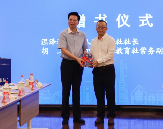温泽远致辞 新书由国务院新闻办公室原主任、上海公共外交研究院专家咨询委员会主席、“公共外交译丛”顾问赵启正和上海市政协副主席、上海公共外交研究院理事长、“公共外交译丛”主编周汉民共同揭幕,丛书编委和顾问代表见证了这一光辉时刻。随后,温泽远代表编委会向上海中华职业教育社常务副社长胡卫赠书,感谢协办方的大力支持。