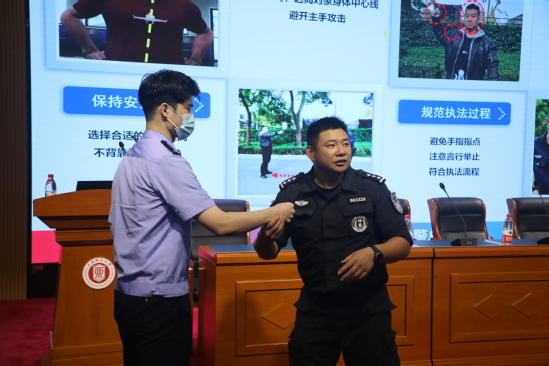 8月25日下午,学校联合上海市公安文保分局治安大队、沪东高校派出所举办2022年警校联动突发事件应急处置培训和演练,校党委副书记、副校长盛春,上海市公安文保分局副局长曲东,上海市教育委员会学校后勤保卫处调研员尹捷出席活动,上海市公安文保分局治安大队、沪东高校派出所警官,学校各部门治保主任、驻校服务保安公司、物业公司,保卫处等相关工作人员参加培训演练。上海市特警总队战训支队格斗教研组组长陶建军、特警总队防爆突击三支队教官陈峰做培训指导,培训会由保卫处处长李志清主持。 培训中,陶建军教官和陈峰教官围绕执法依据、执法原则、预判危险的方法、应对侵害的技巧等内容,对如何应对个人极端事件的处置方法进行了细致讲解,就防暴器材使用、队组战术、处置流程等进行了实操培训。驻校服务保安公司队员和物业公司相关工作人员进行了警棍盾牌等防暴工具实操训练;安保队员现场展示了钢叉及盾牌操队列训练,并展开实战演习,模拟校内发生的一起极端事件开展联合处置。 曲东点评指出,通过此次演练,警校双方应急装备的调用能力、现场处置的反应能力、联合处置的协作能力均得到进一步锻炼和提升,演练达到了预期效果。他强调,一要绷紧思想之弦,加强协同,牢牢守住高校治安稳定的底线。二要抓实演练之本,真正把每一次演练视作案发现场,合力打赢应对之战。三要夯实防范之基,切实把“防”的意识和行动想在前、做到位、贯穿始终。 盛春在总结讲话中对上海市公安文保分局和学校后勤保卫处一直以来对学校安全稳定工作给予的支持表达感谢。他指出,疫情防控常态化背景下高校安全保卫工作显现很多新问题,需要紧密深化校警联合,结合我校实际,抓当前、谋长远,推动校警合作再上新台阶,针对应急演练中暴露出来的不足,要加强应急预案的动态管理,改进和完善应急预案体系,提高学校应急管理工作水平,为迎接党的二十大胜利召开营造良好的安全环境。 此次培训演练,有效增强了学校安全保卫、后勤保障等相关工作人员的安全防范意识,提升了警校联动处置暴力突发事件的能力和水平,为平安校园奠定了坚实基础。