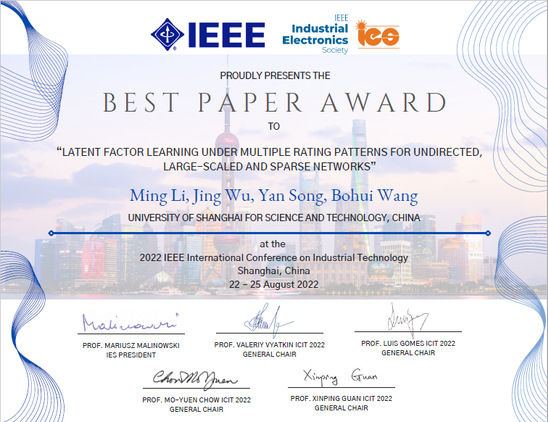 近日,光电学院控制科学与工程专业2019级李明博士在光电学院宋燕教授指导下的最新研究论文《多级评分模式下无向大规模稀疏网络的潜在因子学习》(Latent factor learning under multiple rating patterns for undirected large-scaled and sparse networks )在第23届工业技术国际会议 (The 23rd IEEE International Conference on Industrial Technology , IEEE IES ICIT 2022)上荣获最佳论文奖。该论文第一作者为博士生李明,上海理工大学为第一单位,宋燕教授为唯一通讯作者。 随着信息技术的快速发展,利用传感器网络进行地理信息采集与定位已经变得十分普遍。而无线传感器网络是由大量无线传感器件所构成的,当这些无线传感器部署在地下、水下或者高大建筑物密集的街区时,无线信号严重衰减或者接收不到。此时,无线传感网中大量节点之间的距离信息就像一个高维无向的稀疏网络,就需要通过挖掘该网络中有限的已知信息,对大量的未知信息进行准确估计,实现被测物体的精准定位。 对此,该论文提出了一种多级评分模式下的潜在因子模型。通过构建辅助等级矩阵,结合多情境下的数据信息,利用迁移学习的思想,促进了潜在信息的充分挖掘;运用交替更新的学习方法,加快了模型的训练速度,最终提高了模型对缺失信息的预测精度。最后,在针对海底定位的真实数据集上进行仿真实验,结果表明该论文所提出的模型明显优于现有的模型,同时也表明所估计的数据更加接近于真实数据,这一研究发现将会为计算机精准绘制地图提供极大的帮助,可以用于工业、军事、农业、生物、医疗、经济等众多领域,解决如无人机编队飞行、购物平台商品推荐、医疗系统健康管理等问题。 李明自读博以来,在宋燕教授的悉心指导下开展人工智能与大数据技术方面的研究。截至目前,已发表中科院SCI一区期刊论文5篇(其中,IEEE汇刊论文4篇),大数据领域国际会议论文5篇。