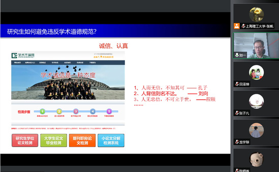 9月9日下午,“留学报国,励志青春——我的留学之路”暨科学道德与学风建设分享会线上举行,光电学院副院长刘一教授为博士研究生作报告,党委组织部(统战部)副部长樊小军以及100余名2022级博士研究生参加分享会,会议由研工部学工办主任张帆主持。 刘一博士毕业后赴法国巴黎综合理工大学开展博士后研究工作,先后取得法国国家科学研究中心副研究员终身职位、巴黎第六大学博导资格,2015年回国后到我校光电学院工作。他结合自己在法国近9年的学习、生活及科研工作经历,从周恩来、邓小平等老一辈革命先驱留法报国索求真理切入,以生动事例向同学们展现了法国高校概况;对比中国和法国等欧美国家近十年来的科技发展,畅谈青春报国理想;通过自身体悟,向同学们分享了有效融入国际学术界、掌握国际学术前沿的宝贵经验;以鲜活案例阐述了科学道德与学风建设的重要性,及学术不端导致的严重负面影响。希望同学们秉承“信义勤爱”校训,坚守学术道德诚信底线,以扎实学风大胆尝试、勇于开拓,开启科学研究新征程。报告结束后,同学们与刘一老师进行了互动交流。