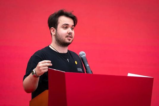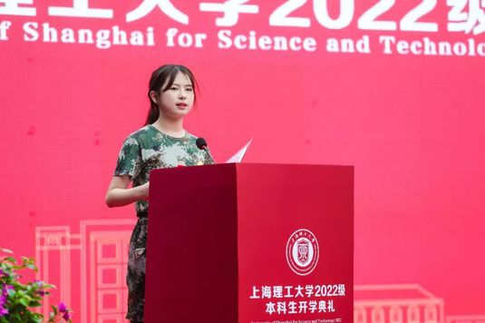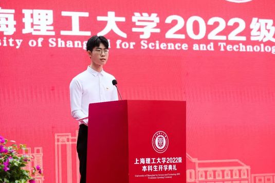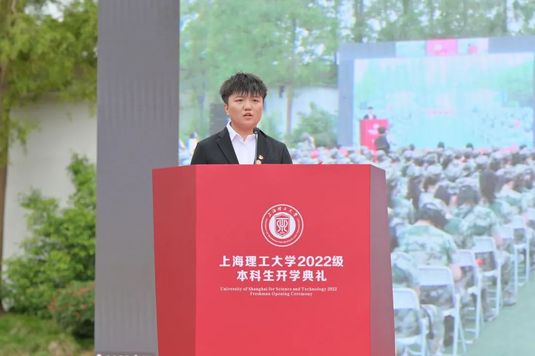 复兴路校区新生代表段懿轩发言 老生代表王叶红、张一凡、Alberto Gallardi分享了自己在上理的求学时光。“在这里,校园可漫步、建筑可阅读、文化可触摸。”他们建议学弟学妹们发展一项有益身心的爱好,珍惜每一份感情,和室友一同进步,和朋友们彼此关怀,四年以后,可以带着满满的温暖的回忆和上理挥手。