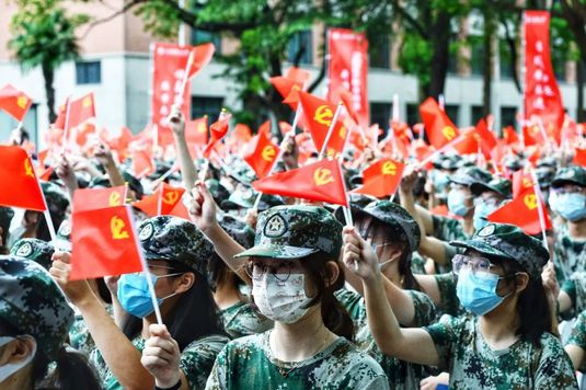 全体师生挥舞着党旗和国旗,齐声合唱校歌