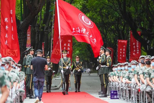盛春主持开学典礼 “五!四!三!二!一!”在新生们的倒计时呐喊中,2022年军训剪影短片《铁骨燃斗志 热血颂青春》拉开了开学典礼的序幕。目光坚毅,步履铿锵,口号嘹亮,英姿飒爽。短片再现了2022年新生军训的精彩瞬间,展现了新上理人奋发进取的精神面貌。“信义勤爱、思学志远,我们是新上理人!”新生们嘹亮的口号声回荡在开学典礼现场的每一个角落。三个会场的挥旗联动更是让新生们的热情与活力弥漫整个校园。 上午八点三十分,在全体师生的肃立注目下,英姿飒爽的国旗护卫队迈着铿锵有力的步伐护送五星红旗缓缓入场。伴随着庄严的国歌声,鲜艳的五星红旗在金秋的晨光中熠熠生辉。随后校旗队精神抖擞,步履铿锵护卫校旗走向主席台。