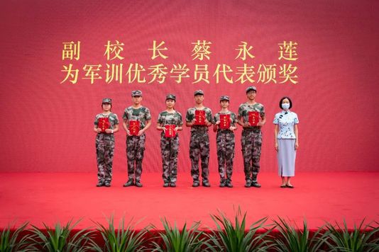 校旗队护卫校旗入场 顾春华宣读了关于表彰军训优秀学员、优秀教官、优秀工作人员和优秀指导教师的决定。校领导刘道平、孙跃东、陈斌、蔡永莲、张道方、赵明、张华分别为受表彰人员代表颁奖。