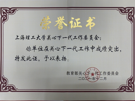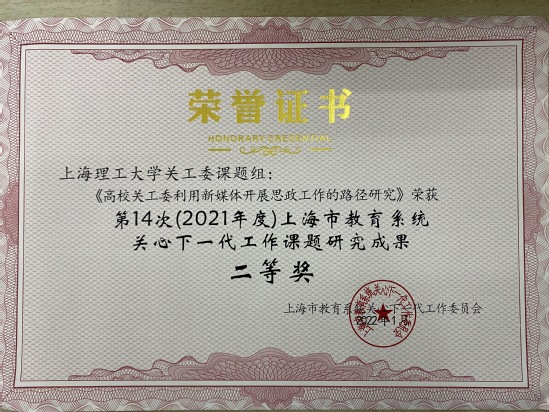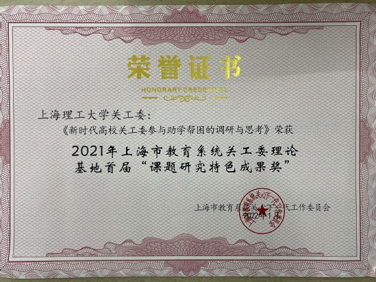 近日,上海市教育系统关工委召开贯彻落实中办、国办“意见”专题工作会议,会上表彰了一批先进集体、课题调研成果奖、基层“五好关工委组织”等。其中,我校获“全国教育系统关心下一代工作先进集体”称号、2021年“读懂中国”活动优秀组织奖(市教育关工委系统)、3项课题成果获奖,能动学院关工委获上海市教育系统基层“五好关工委组织”称号。 继我校关工委2016年获“全国教育系统关心下一代工作先进集体”称号(5年评选一次)后,这次再获殊荣,是我校党政主导、“五老”发挥主体作用、职能部处协同发力、二级学院关工委积极作为的结果。 长期以来,校党委高度重视关工委工作,将其作为育人工作的重要组成部分,纳入学校事业的大局统筹考虑,纳入重要议事日程专题研究,纳入思政工作大局。围绕立德树人根本任务,学校全面贯彻落实习近平总书记对关心下一代工作作出的重要指示、全国教育大会精神,深入贯彻中办、国办《关于加强新时代关心下一代工作委员会工作的意见》(厅字〔2021〕46号)、《中共教育部党组关于加强新时代全国教育系统关心下一代工作委员会工作的意见》(教党〔2021〕34号)、《中共上海市教育卫生工作委员会关于加强新时代教育系统关心下一代工作委员会工作的实施意见》(沪教卫党〔2021〕201号)文件精神,出台了《中共上海理工大学委员会关于加强新时代关心下一代工作委员会工作的意见》(上理工委〔2022〕14 号),进一步加强组织、队伍、制度建设和工作创新发展。校关工委根据“五老”所能,找好工作结合点和切入点,以社会主义核心价值观引领青年健康成长,形成了特邀党建组织员助力基层党建、“老少结对 成长导航”、老党员结合校史讲“四史”、退休支部与青年师生支部党建联建、助学帮困、老同志指导师生科技创新、参与“新生适应性教育”课程体系等特色品牌。 同时,校关工委注重课题研究,此次受表彰的2021年度课题成果中,我校关工委课题组《新时代高校关工委参与助学帮困的调研与思考》(课题组组长:田蔚风)荣获2021年上海市教育系统关工委理论基地首届“课题研究特色成果奖”;《高校关工委利用新媒体开展思政工作的路径研究》(课题组组长:苏金发)、《高校关工委“五老”参与学校党史学习教育的实践探索与机制建设研究》(课题组组长:杨佐平)均获2021年度上海市教育系统关心下一代工作课题研究成果二等奖。