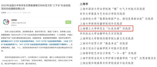 10月4日,共青团中央公布了2022年全国大中专学生志愿者暑期文化科技卫生“三下乡”社会实践活动总结结果,“上海理工大学研究生‘红色先锋’实践团”脱颖而出,荣获全国“2022年‘三下乡’社会实践优秀团队”称号。