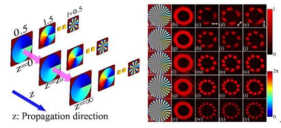 分数拓扑荷旋涡光束实验图及空间传输原理图