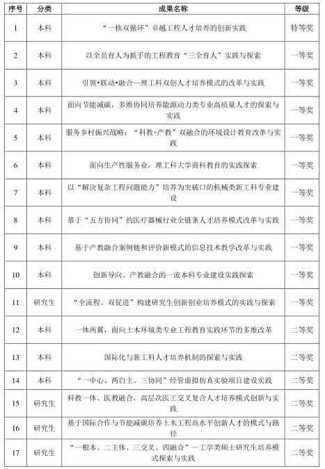 近日,上海市教育委员会、上海市人力资源和社会保障局公布“2022年上海市优秀教学成果获奖名单”,我校作为第一完成单位共有17项教学成果荣获本届上海市教学成果奖(高等教育类),其中特等奖1项、一等奖10项、二等奖6项,特等奖和一等奖(高等教育类)获奖数量在上海市属高校中位列第二。 本次获得特等奖成果为《“一核双循环”卓越工程人才培养的创新实践》。该成果坚持质量核心,把质量发展的新要求落实到工程人才培养的各环节。课内课外循环,开展 “五课程一体系”、科研项目课程、荣誉课程等教学改革,优化卓越工程人才培养体系。校内校外循环,校企合作打造产业技术学院,医校协同拓宽卓越工程人才培养渠道,区域协同推动长三角工程教育联盟合作,形成卓越工程人才协同培养平台。经过十几年不懈努力,卓越工程教育理念深入人心,学校工程人才培养更加注重成效和质量。成果多项内容多次入选上海教育综合改革典型案例,方案受到教育部、上海市教委等教育主管部门的肯定。 教学成果奖是对学校人才培养工作和教育教学改革成果的检阅和展示。学校坚持“卓越工程教育”,推动卓越工程人才培养改革,建设引领产业技术进步的一流理工科大学。本次市级教学成果奖取得历史性突破,是我校多年来坚持以人才培养为中心、扎实推进教育教学改革、注重教学成果凝练的具体体现。学校将充分发挥教学成果奖的示范引领作用,加强获奖成果在人才培养全过程中的应用与推广,切实提高学校教育教学水平和人才培养质量。