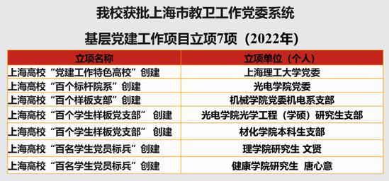 近日,上海市教卫工作党委公布了第二轮上海高校党组织“攀登”培育创建单位名单和上海高校“百个学生样板党支部”、“百名学生党员标兵”创建名单,我校共有5个党组织和2名党员入选,基层党建工作再创佳绩。 其中,学校党委、光电学院党委、机械学院机械电子党支部分别作为上海党建工作特色高校、标杆院系、样板支部培育创建单位,光电学院光学工程(学硕)研究生党支部、材化学院本科生党支部入选上海高校“百个学生样板党支部”,理学院研究生文贤、健康学院研究生唐心意被评为“百名学生党员标兵”。 近年来,学校党委始终坚持以习近平新时代中国特色社会主义思想为指导,认真贯彻落实《中国共产党普通高等学校基层组织工作条例》精神,以战略思维推进基层党建质量提升,强化统筹,优选优培。2018年以来,先后获批市级以上基层党建工作创建项目26个,其中教育部立项8个、市委组织部立项1个,市教卫工作党委立项17个。按照建设计划,第一批双创项目已顺利完成建设验收。下一步,学校党委将全面贯彻落实党的二十大精神,聚焦党建质量提升工程建设目标,深化党的全面领导,以党的政治建设为统领,以组织体系建设为重点,以组织力提升推动事业发展为落脚点,不断增强党组织政治功能和组织功能,以高质量党建引领学校事业高质量发展,为服务国家战略、服务上海发展作出新的更大贡献。