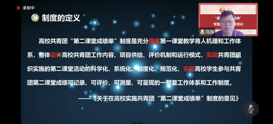 11月25日下午,“第二课堂成绩单”专题讲座暨系统培训在先进制造大楼辅楼报告厅举行。校团委邀请了团中央全国学校共青团研究中心活动部部长、全国二课首席专家马海远程作主题为“共青团‘第二课堂成绩单’高质量建设工具包”的线上专题讲座。学院团委书记、校院两级二课骨干、全校第二课堂网络系统管理员主会场参会,本研团支书280余人线上参会。 我校在2021-2022学年全国本科院校第二课堂活动审核时间中取得了第一名的好成绩,马海对我校“第二课堂成绩单”建设给予充分肯定。培训会上,他首先从定义、背景和内容三方面深度解读了“第二课堂成绩单”制度,介绍了第二课堂高质量管理工具包和操作工具包,以及从体系建设角度如何加强第二课堂高质量工具包建设、推进建设科学专业的学生综合素质评价体系。他指出,第一课堂规划了学生的职业,而第二课堂决定了学生未来在职业岗位中的高度;第二课堂可借鉴第一课堂育人机制,在科学化、系统化的基础上更加实践化和职能化,完善评价指标体系和数据库建设,提升第二课堂活动的科学性;还创新式提出通过建设第二课堂精品课程库、建设二课教学体验中心等建议。讲座后,校团委负责同志对全校第二课堂网络系统管理员、团支书进行了“到梦空间”的使用培训及常见问题解答和交流。 此次讲座对我校第二课堂总体规划和基层团组织的实践操作具有很高的指导意义。在团中央的指导下,校团委会进一步加强第二课堂的管理工具包和操作工具包建设,完善二课课程项目体系建设、打造二课运营动态管理体系,促进“第二课堂成绩单”成为我校“五育并举”的记录评价工具和测量呈现平台,促进学生德智体美劳全面发展。