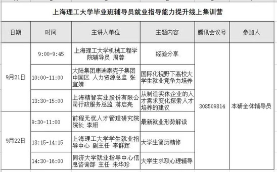 培训由上海理工大学学生处副处长、就业指导中心主任冯磊主持,校党委副书记、副校长盛春出席开班仪式并致辞。来自上海交大、同济大学等上海30余所高校,共计50名就业、学工相关部门老师参加。上海中医药大学马克思主义学院党总支书记陶思亮教授等四位专家从课题指导、研究方法、研究工具和选题创新等多个方面对大学生就业创业教育研究能力进行了指导。培训班有效帮助老师们提升对大学生就业创业教育的研究能力,提高就业创业教育职业化、专业化水平。 以“精准就业”培训推动实现更高质量就业 为进一步加强高校毕业生就业指导师资队伍建设,上海高校辅导员培训研修基地(上海理工大学)于10月27日至28日在线上举办了2022年上海高校“精准就业”专题师资培训班。上海市学生事务中心副主任周红星出席开班动员,参与培训的学员共计140名,分别来自复旦、同济等30余所高校。 培训邀请五位来自南京大学等高校的教师学者和“毕业申”等市场平台的资深专家从“生涯教育、数字化、工作方法与维度、就业形势”等多个方向为培训学员们带来了精彩讲座。通过“精准就业”专题师资培训,推动教师指导学生实现更加充分更高质量就业。 打造高质量“空中课堂” 提升辅导员就业创业指导能力 9月21日至22日,由上海市高校毕业生就业创业工作示范基地(上海理工大学)承办“上海理工大学毕业班辅导员就业指导能力提升训练营”,全体2023届毕业班辅导员参加培训。培训有助于毕业班辅导员为同学们推荐就业信息和岗位提供有针对性的指导和帮助。