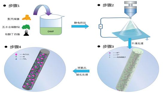 柔性光催化碳纳米纤维复合材料(Bi/BixTiyOz-TiO2/CNFs)制备过程示意图