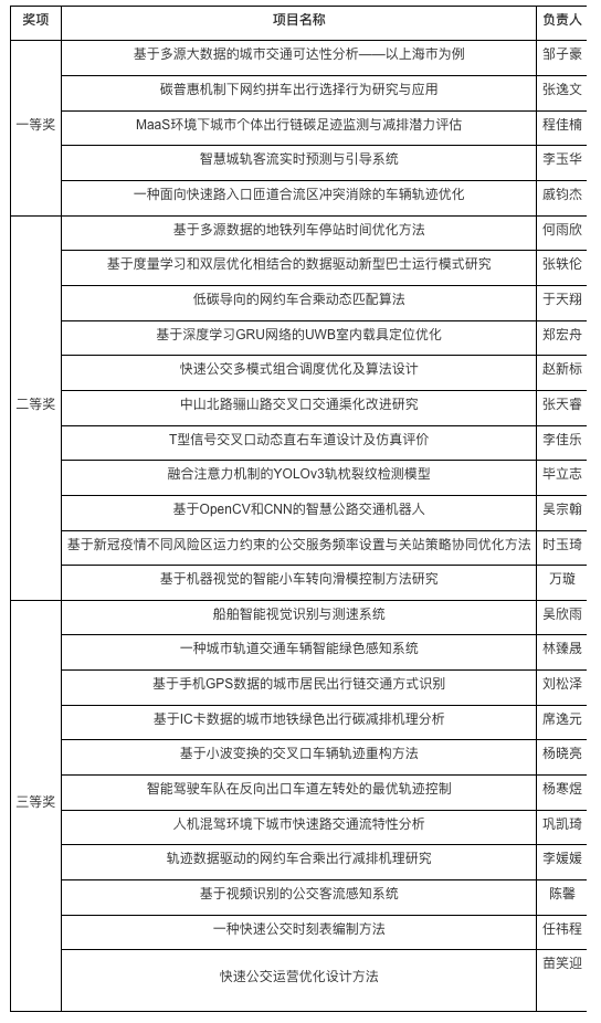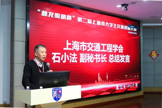 颁奖仪式 上海市交通工程学会副秘书长石小法在总结发言中对本次参赛作品给予了高度肯定,指出本次大赛充分响应了国家《“十四五”现代综合交通运输体系发展规划》提出的构建高质量综合立体交通网,加快智能技术深度推广应用,全面推进绿色低碳转型等战略目标,也充分展示了上海市交通运输相关专业大学生的创新能力与科研素养。最后,他代表主办单位宣布第二届年上海市大学生交通创新大赛圆满结束。
