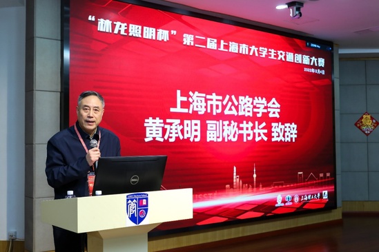 赵靖主持开幕式 上海市公路学会副秘书长黄承明代表大赛主办单位对我校承办本届大赛表示感谢,并简要介绍了上海市公路学会的基本情况以及与我校的合作关系,希望进一步夯实双方的合作基础,培育新一代交通创新力量。
