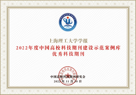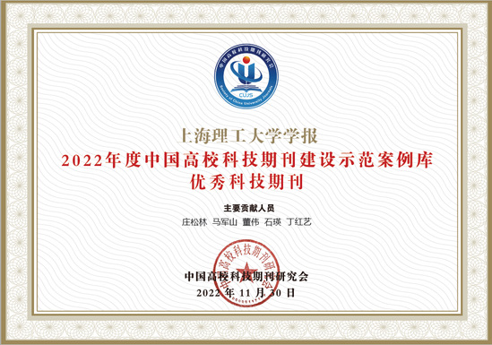 近日,中国高校科技期刊研究会公布了“2022年度中国高校杰出·百佳·优秀科技期刊”遴选结果,《上海理工大学学报》成功入选“2022年度中国高校科技期刊建设示范案例库·优秀科技期刊”,我校学报已连续4届获得该奖项。 此次评选是经中国高校科技期刊研究会征集和期刊出版单位推荐,通过对国内外相关数据库和评价机构的评价、计量结果等第三方客观数据进行加权计算,经过反复审核、确认后产生。最终从1600多种高校科技期刊中,选出杰出科技期刊30种,百佳科技期刊169种、优秀科技期刊278种。 近年来,学校高度重视期刊建设,为期刊发展创造了良好的条件。学报在学校、编委、审稿专家以及作者的大力支持下,立足我校学科优势,不断探索办刊新路径,在学术质量和影响力提高方面取得了一定成效,持续为北大核心、CSCD、Scopus、SCD等核心数据库收录。编辑部将继续挖掘学科资源,严把质量关,为建设高品质期刊,助力学校高水平大学建设作出贡献。