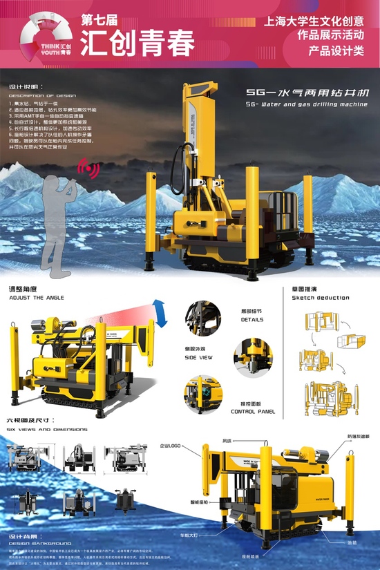 上海工程技术大学:《5G-水气两用钻井机》 这是一款水气两用钻井机设计,目的是解决传统水井钻机存在的结构暴露、整体性差等问题。外观上美观 采用包容式设计,符合具有国人审美倾向的机械美学;经济性上,钻井结构采用了水钻和气钻一体化的功能性设计,使钻井效率得到了提高;机动性上,为钻井机添加了座舱设计,解决了以往的人机操作矛盾问题,驾驶员可以在舱内完成任务控制,并可以在恶劣天气正常作业;操控上,使用者可以通过手机app远程控制机器的升降,实现对多任务的单机控制。