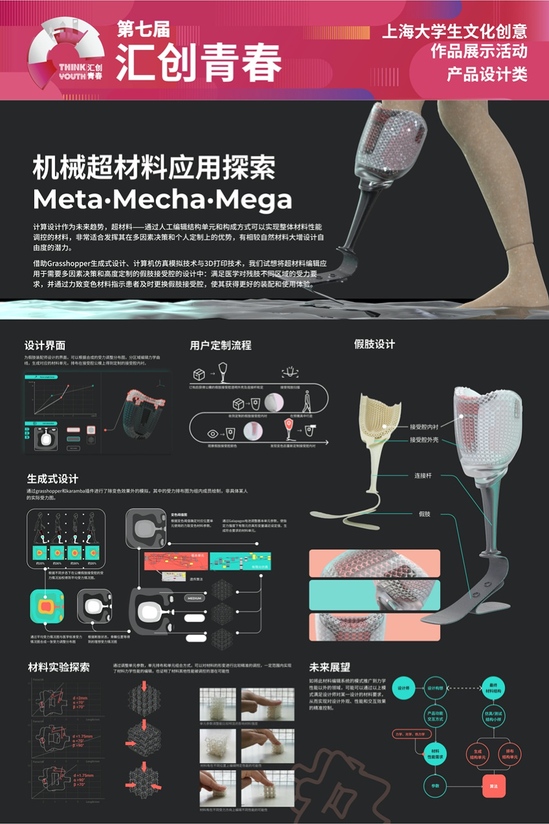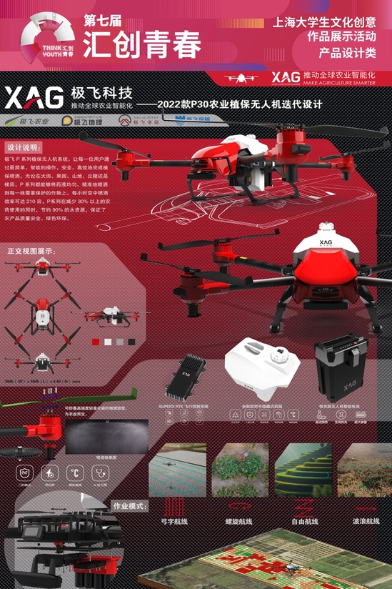 同济大学:《Meta·Mega·Mecha假肢接受腔》 计算设计作为未来趋势,超材料——通过人工编辑结构单元和构成方式可以实现整体材料性能调控的材料,非常适合发挥其在多因素决策和个人定制上的优势,有相较自然材料大增设计自由度的潜力。借助Grasshopper生成式设计、计算机仿真模拟技术与3D打印技术,我们试图将超材料编辑应用于需要多因素决策和高度定制的假肢接受腔的设计中,满足医学对残肢不同区域的受力要求,并通过力致变色材料指示患者及时更换假肢接受腔,使其获得更好的装配和使用体验。 华东理工大学:《2022款P30农业植保无人机迭代设计》 该设计基于极飞科技公司已有产品所进行迭代概念设计,极飞 P 系列植保无人机系统,让每一位用户通过最简单、智能的操作,安全、高效地完成植保喷洒。无论在大田、果园、山地、丘陵还是梯田,P 系列都能够将药液均匀、精准地喷洒到每一株需要保护的作物上。每小时空中喷洒效率可达 210 亩,P系列在减少 30% 以上的农药使用的同时,节约 90% 的水资源,保证了农产品质量安全、绿色环保。