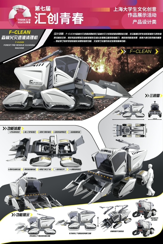 上海理工大学:《F-Clean森林火灾遗渣清理机》 设计理念:F-CLEAN森林火灾遗渣清理机用于森林火灾之后的遗渣清理回收过程,该设备通过铲灰结构将渣灰与其他物质分离后打碎,然后传送进粉粒压缩机将渣灰压缩以此提高设备的存储能力。剪树机构能够清理、修剪大部分的未燃烧植物。既起到了保护环境的渣灰清理的物质功能,又起到了资源可持续发展的精神功能。