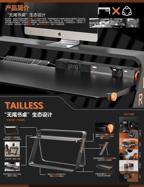 作品名称: TAILLESS无尾书桌生态设计 作者:王鸣杰 指导教师:定律 作品简介:桌面办公用品都在朝着智能化、生态化的方向发展,使用智能化的产品最难以避免的问题就是产品的供电和充电问题。桌面电子产品搭配的电源线导致现在书桌十分杂乱,因而“无尾书桌”这一概念应运而生。“无尾书桌”是基于松耦合磁共振技术,摒弃桌面繁杂的电源线,实现桌面智能办公用品无线充电的概念,为使桌面达到一个极致的收纳简洁的效果,将系列生态产品进行模化设计,融入无尾书桌生态,形成极简的视觉效果。