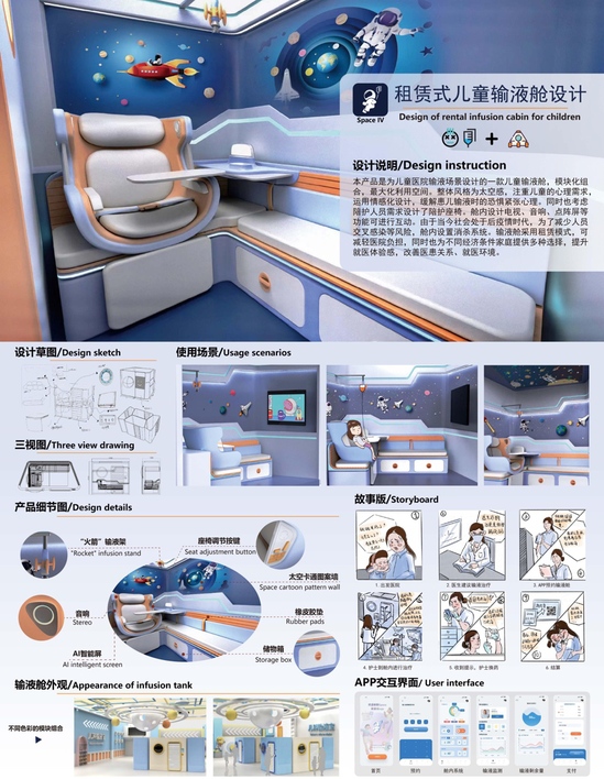作品名称:租赁式智能型儿童输液舱设计 作者:潘钰婕、吴宇辰 指导教师:倪瀚 作品简介:本产品选取儿童医院输液室场景进行输液设备产品设计,将从智能设备租赁角度的医疗产品为设计切入点。由于当今社会处于后疫情时代,为了减少患儿交叉感染等风险,改善就诊体验感提出“输液舱”概念,结合智能型输液管理系统设计出一款“租赁式智能型儿童输液舱”产品。这样的独立输液空间概念发挥了其密闭性好、人员交叉感染率等特点,配合租赁的商业模式以给医院降低负担,给不同经济条件的病患提供多种选择,改善就医环境,提高就诊体验感。 |