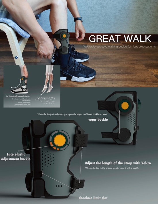 作品名称: GREAT WALk 作者:闫显龙、邹雪靖 指导教师:谌涛 作品简介:Great Walk是一款户外行走辅助设备,专为因腰椎椎管狭窄导致神经压迫从而引发足下垂的患者设计。足下垂患者由于脚部控制神经被压迫,因此在行走时,脚尖无法自主抬起,落脚时脚尖先触地,这种症状极大地增加了患者行走时的磕绊甚至摔倒的风险。Great Walk使用简单、佩戴便捷、耐用性高,能有效帮助足下垂患者在行走中调节步态,改善足下垂患者在行走中抬脚无法背屈、落脚时脚尖先触地等症状,以此减少因足下垂病症在行走中带来的伤害与风险,该产品采用了非固定性的结构设计,非固定性的结构设计可以使踝关节和胫骨肌肉充分参与运动,有助于健康恢复,并且整体形态设计上与鞋子进行巧妙结合,在保证辅助行走功能的同时,减轻了产品佩戴负担,能够带来轻松舒适的使用体验。