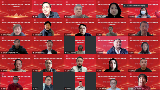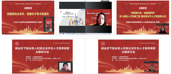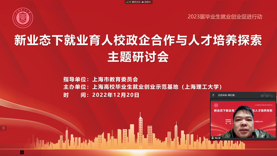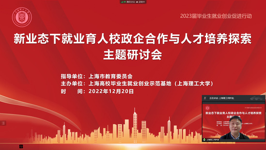 12月20日下午,由上海市教育委员会指导、上海高校毕业生就业创业示范基地(上海理工大学)主办的“新业态下就业育人校政企合作与人才培养探索主题研讨会”在线上举办。校党委副书记、副校长盛春致辞。上海市学生事务中心副主任周红星,杨浦区人力资源和社会保障局副局长周遐玮,松江区人力资源和社会保障局党组副书记谢春讯,临港新片区投资促进服务中心人才服务部业务主管孙静怡,中国商飞公司、智联招聘、毕业申等企业代表,复旦大学、上海交通大学、同济大学、华东理工大学等高校招生、就业中心负责人代表,我校研究生工作部部长彭宗祥,科技发展研究院院长刘宝林,学生工作部(处)副部(处)长冯磊及学生就业指导中心、研究生部相关老师参加研讨会。研讨会由学生处处长何炉进主持。