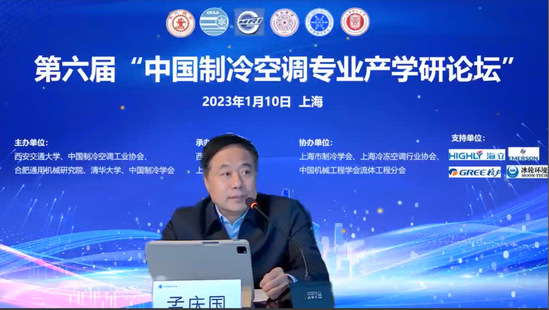 张朝晖致辞 樊海彬副总经理代表合肥通用机械研究院致辞,合肥院作为行业研究院所代表,长期致力于制冷空调行业产学研发展,促进中国制冷空调行业产业升级,希望论坛越办越好。 李俊明教授代表清华大学致辞,他从学术角度阐明了制冷空调行业中产学研协作发展的优势与意义,认为论坛为制冷空调学术与产业发展建立了纽带,提供了富有成效、极有意义的交流平台。 孟庆国特邀副理事长代表中国制冷学会致辞,他深情回顾了10年来“中国制冷空调专业产学研论坛”的成长与发展,中国制冷学会作为制冷空调学术组织积极开展“双碳”问题研究和技术推广,支持论坛持续开展,并祝论坛成功举办。