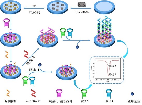 近日,中古国际肿瘤诊断与能量治疗联合实验室揭牌以来发表首篇研究成果:我校欧阳瑞镯教授、刘宝林教授、缪煜清教授与古巴哈瓦那大学Abel Ibrahim Balbín Tamayo教授在人体血样中的生物标志物微RNA(miRNA-21)的快速灵敏检测方面开展合作研究,以一种基于手风琴状氧化铋和碳化钛纳米复合材料(Ti3C2@Bi2O3)构建电化学生物传感器,实现了微RNA的超灵敏检测,为癌症、肺动脉高压等重大疾病的临床早期快速诊断提供了潜在新方法、新策略。研究文章“手风琴状氧化铋和碳化钛纳米复合材料用于微RNA的电化学检测”(Ti3C2@Bi2O3 nanoaccordion for electrochemical determination of miRNA 21)发表在《微量化学学报》(Microchimica Acta)上,该论文第一作者为欧阳瑞镯教授、研究生姜岚、谢先进以及上海市肺科医院袁平博士,通讯作者为欧阳瑞镯教授、Abel Ibrahim Balbín Tamayo教授、刘宝林教授和缪煜清教授,上海理工大学为第一单位。 中国的铋金属储量和产量居世界首位,开展铋基纳米材料的研究具有得天独厚的资源优势。铋是原子序数最大的非放射性元素、它的化学性质稳定且易与氧族元素结合,可形成形貌丰富的铋基纳米材料。而且,铋基纳米材料安全无毒、可生物降解、生物相容性好,还易于功能化与表面修饰,在生物医学领域备受青睐。 此次研究就是围绕铋基纳米材料开展工作,团队通过在手风琴状碳化钛(Ti3C2)高度折叠的表面生长氧化铋(Bi2O3)纳米颗粒,赋予氧化铋@碳化钛纳米复合材料优异的生物相容性和超高的比表面积,可通过碰撞有效促进杂交连反应的杂交效率;另外,在氧化铋@碳化钛的手风琴状表面电沉积纳米金进一步提升了纳米复合材料的电化学性能和电极表面固定捕获微RNA的探针的能力,进而发展了基于氧化铋@碳化钛复合材料的电化学信号放大和杂交连反应信号放大的双信号放大策略,基于此所构建的电化学传感器对人体血样中微RNA的检测呈现超高灵敏度,检测限低至0.16 fM,显著优于目前临床所使用的实时荧光定量PCR检测方法。该策略在多种微RNA的同步多通道传感检测方面也具有明显优势。因此,所构建的氧化铋@碳化钛基传感平台在重大疾病尤其是癌症的早期诊断与筛查中具有潜在的应用前景。该工作充分体现了铋基纳米材料在生物传感与医学检测方面的优势,有效推动了我校中古国际肿瘤诊断与能量治疗联合实验室在生物传感与医学检测方面的工作进展,开辟了铋基纳米材料的新用途。 自2020年上海理工大学与哈瓦那大学签订框架合作协议以来,我校与古巴哈瓦那大学的科研人员共同在肿瘤诊断与治疗、止血材料等领域进行攻关,已发表多项双方共同研究成果。双方共同构建了一种壳聚糖基光交联水凝胶用于在术中对湿性脏器表面的快速止血和湿性皮肤止血,这项技术为湿创面止血提供了重要的研究基础。以氧化铈为基础构建复合型电化学分析免疫传感器用于血液中超灵敏微RNA-21,为肿瘤早期诊断提供了有效的检测方法与技术。除此之外,双方还在肿瘤能量治疗、肿瘤细胞治疗、肿瘤治疗器械等方面开展研究。 联合实验室及其合作研究既是两校合作交流的延续和深化,更是两校积极响应“一带一路”倡议、贯彻落实中古两国元首达成的重要合作共识的生动实践。两校将以此为契机,全面推动双方的深度合作,努力为促进两国科教发展、人文交流贡献应有力量。