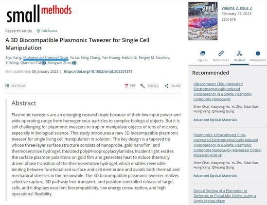 近日,中英国际学院教师Muhammad Shemyal Nisar博士以共同第一作者身份在国际期刊Small子刊Small Methods(中科院二区,影响因子:15.367)发表了“用于单细胞操纵的生物相容性等离激元镊子”(A 3D Biocompatible Plasmonic Tweezer for Single Cell Manipulation)的研究成果,提出了一种新的生物相容性等离激元镊子,能实现溶液中单个细胞的三维操纵。 论文提出的等离激元镊子表面由光纤耦合纳米光纤探针、金膜、巯基化聚N-异丙基丙烯酰胺(PNIPAM-SH)温敏水凝胶三层结构组成。通过光纤导入的入射光激发金膜上的表面等离激元传播并产生热量以诱导温敏水凝胶的相变,从而实现功能化温敏表面和细胞膜之间的可逆结合,避免热应力和机械应力。该技术结合微操作系统实现了溶液中单细胞的选择性捕获、自由移动和可控位置释放,具有优异的生物相容性、良好的平台兼容性和低能耗、高灵活性等优点。未来有望在单细胞分析、单细胞分选、细胞异质性等多种单细胞研究中发挥作用。该文章受到威力(Wiley)旗下材料科学类期刊官方平台Materials Views China报道。 近年来,中英国际学院高度重视人才队伍建设,有针对性地引进一批海内外优秀人才,不断优化教学科研管理服务各项机制,激发青年教师科研活力和工作热情。Nisar博士于2021年9月加入中英国际学院担任讲师,在承担大量教学任务的同时,坚持教学与科研相结合,在学院支持下从事纳米光子学领域的学术研究,其研究范围涉及生物医学、光学计算等领域。在过去两年里,Nisar博士共发表了6篇高水平论文,这些成果的取得表明学院引进人才和激励开展科研的相关政策措施逐渐显现成效。中英学院将持续把人才优势、科技优势转化为创新优势、发展优势,为学校高质量发展注入“源头活水”。