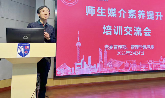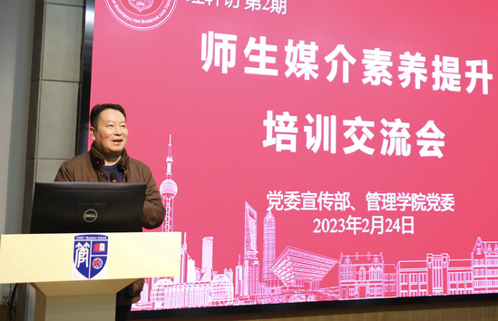 张炜分享关于校园宣传报道工作的经验和感悟 此次培训交流活动是学校新闻中心主办的“理轩坊”——旨在提升校内师生媒介素养的培训交流平台——组织的今年首场活动。活动由新闻中心骨干主讲,吸引了管理学院各系通讯员、全体辅导员和行政人员、院系两级部分领导等40余人参加。管理学院党委书记马静波主持活动。
