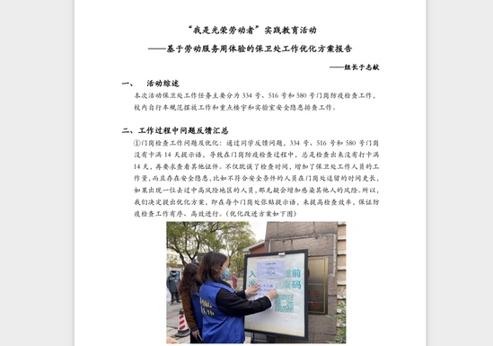 学区、宿区的党员先锋岗值岗 团员跟上:让服务迸发青春朝气 打造“凌晨五点半”暖心感恩志愿服务活动品牌,拓展研究生劳动教育、感恩教育、志愿服务的多维载体,实现五育融合、弘扬志愿服务、引领青年发展,激励广大学子争做有理想、敢担当、能吃苦、肯奋斗的新时代好青年。服务活动于每年大寒之日开展,已连续5年,累计向门卫、宿管、保洁工人等基层劳动者送上爱心礼物500余份,通过角色体验等累计服务时长1000余小时。 构建“4+X”劳动服务育人体系,与学校保卫处、后勤管理处、图书馆和公共试验中心四个部门结对,每年提供定量的劳动服务岗位,开展定向服务活动。“做+思”是劳动服务育人一个特色,在服务过程中思考问题的解决,主动贡献青年智力。来自机械学院的于志献面对服务中发现的问题,就提出了《基于劳动服务周体验的保卫处工作优化方案报告》,详细分析了存在的问题及解决对策,此案例也入选优秀劳动调研报告。