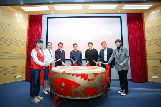 市文明办、校领导和师生代表共同擂响创全决胜战鼓