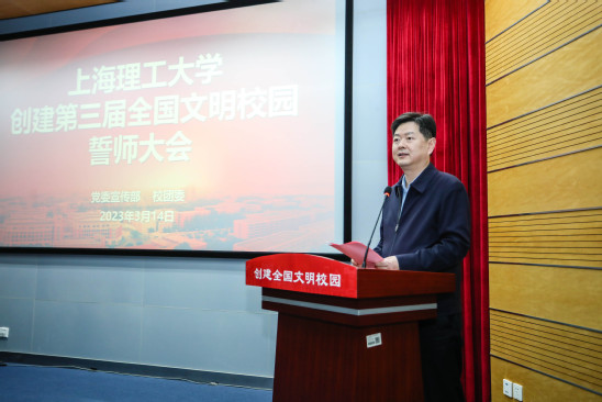 3月14日上午,学校在光电学院报告厅召开第三届全国文明校园创建誓师大会。上海市精神文明办王薇、曹杰,市教卫工作党委宣传处郁晓昕,上海理工大学校长丁晓东,党委副书记孙跃东,党委副书记、副校长盛春,各二级党组织负责人、各职能部处负责人及师生代表出席会议。会议由孙跃东主持。 教师代表史玉和学生代表车红玉分别宣读创全工作倡议书。教务处、教工部、学工部、后勤处和版艺学院负责同志围绕创全工作作表态发言,表示要积极作为、主动发力,共同打好创全攻坚战。随后,市文明办、校领导和师生代表共同擂响上海理工大学创建第三届全国文明校园的决胜战鼓,传递信心、振奋精神,为学校创建成为第三届全国文明校园的奋斗目标全力冲刺。 上海市精神文明办王薇对上海理工大学阶段性创建成效给予肯定。她对学校全国文明校园创建工作提出两条建议。一是全面对标对表全国文明校园创建各项指标要求,找准创全工作发力点,把文明校园创建各项工作落细落实;二是全校上下人人响应、人人参与、人人尽责,汇聚起文明创建工作的强大合力,不断将创全工作推向深入。 丁晓东作总结讲话时强调,学校要以创建全国文明校园为契机,提升全校干事创业精气神,推动学校事业高质量发展。各单位要竞显担当、昂扬斗志,以“时时放心不下”的责任感协同做好创全冲刺工作,真正让“创全没有局外人”深入人心。他指出,在创全关键时期,全校上下既要认清形势、保持警醒,也要正视问题、提振信心。结合学校“五个人人”理念,他对创建全国文明校园工作提出具体要求。第一,坚持价值引领,厚植精神沃土,推动师生人人都能成功出彩。学校要推动文明创建与事业发展同向同行,坚持“发展是硬道理”,引领教师成就事业,引导学生成长成才,塑造校园良好精神风貌。第二,坚持稳步推进、广泛参与,推动师生人人参与校园治理。学校继续建好用好 “上理12345”师生意见建议受理平台,调动师生参与学校治理的热情,全力打造校园治理共同体,推动文明创建工作常态长效。第三,用“有温度”的后勤服务,推动师生人人都能共享品质校园。以师生为中心,着力解决师生最急最忧最盼最直接的紧迫问题,用看得见的校园变化回应广大师生的关切和期盼,增强师生的满意度、获得感、幸福感。第四,关注师生诉求,推动师生人人都能感受温馨大学的暖意。各单位要持续优化服务,提升管理服务水平,弘扬校园正能量,促进学校和谐发展。第五,坚持文化自信,推动师生人人都能归属认同。各单位要持续改善办学环境,优化学校育人环境,营造师生干事创业的良好氛围;要积极行动,不断提升创建全国文明校园的知晓度和参与度;要围绕创全工作各项要求狠抓落实、注重实效,努力抢占全国文明校园创建制高点。 会议表彰了2022年志愿者之星、网络文明志愿者优秀个人和志愿者服务优秀集体。为鼓励2023年继续做好学校志愿者服务工作,还举行了创建全国文明校园文明志愿者督察队授旗仪式。