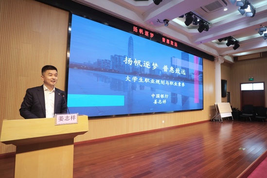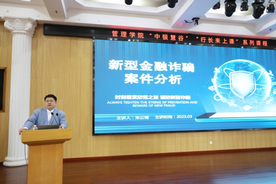 “中银慧谷”产教融合实训基地启动 “持续推进”——多维发力扎实推动育人实效落地 2022年12月7日,中国银行杨浦支行党委书记、行长姜志祥为管理学院金融专业本科生讲授“商业银行业务与经营”课程;2023年3月9日,中国银行闵行支行银都路支行党支部书记、行长朱公博为管理学院金融专业本科生讲授“金融学”课程。 姜志祥授课