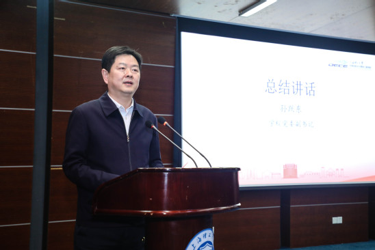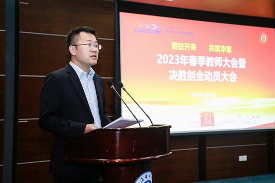 庄松林动员讲话 孙跃东在总结讲话中对学院过去一年取得的成绩表示肯定,面向未来,他谈了三点希望:一是深入学习宣传贯彻党的二十大精神,学院要永葆“闯”的精神,把党的二十大精神、全国两会精神和市第十二次党代会精神贯彻好落实好,统筹谋划好各项事务,以拼抢实的作风,聚精会神谋发展、心无旁骛抓发展、集中精力推发展;二是牢牢把握高校立德树人根本任务,学院要夯实“干”的作风,以党建引领人才培养,加大人才引进培育力度,加快产学研成果转化,以时不我待紧迫感发扬依托行业、产学研相结合的办学传统,坚定不移走内涵发展之路;三是以饱满的热情创建全国文明校园,学院要激发“创”的劲头,以创建全国文明校园为核心,在思想道德建设、领导班子建设、教师队伍建设、校园文化建设、优美环境建设、活动阵地建设等方面下功夫、显特色,以此推动学院和学校各项事业快速发展。