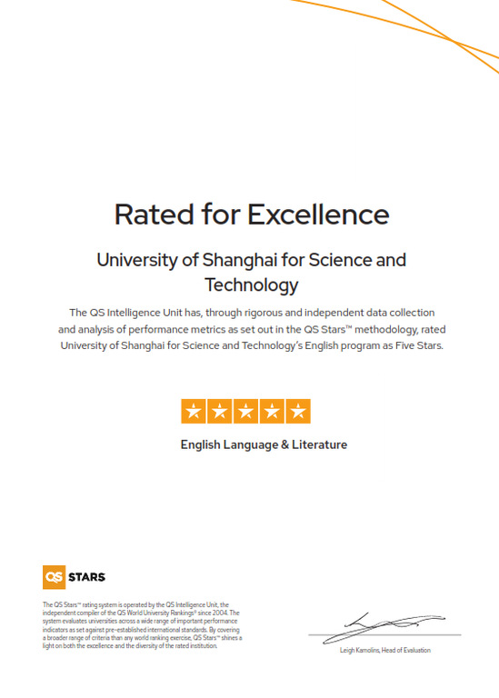 我校学子获“中国大学生5分钟科研英语演讲”全国总决赛特等奖 同时,学院紧紧把握“双万计划”建设契机,积极加大专业建设支持力度,不断推动本科专业教育理念、教学模式和方法创新。英语专业(含“科技翻译”和“中美合作”两个方向)和德语专业分别入选2021年度国家级一流本科专业建设点和2021年度上海市一流本科专业建设点。英语专业于2021年提出QS Stars评级申请,2022年获评最高级别的五星评级,这是学校第一个获得QS Stars五星认证的本科专业,同时学校也成为国内首家获得本科专业QS Stars五星认证的高等院校。