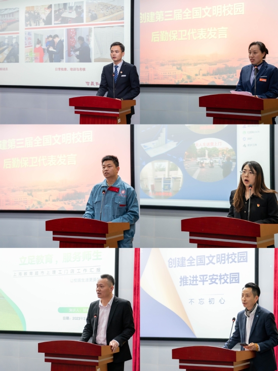 3月31 日,创建第三届全国文明校园后勤保卫动员大会在光电大楼报告厅举行。校党委副书记、副校长盛春,校党委常委、宣传部部长叶磊出席会议,后勤管理处、保卫部(处)全体教职工和驻校服务单位代表150余人参加会议。会议由后勤管理处处长李志清主持。 大会首先对后勤管理处、保卫部(处)遴选的2022年驻校服务单位抗疫先进个人“最美后勤人”“校园卫士”,2022 年度学校年终考核后勤保卫“嘉奖、记功”人员,2021年度上海市学校后勤保卫系统“孺子牛”“拓荒牛”“老黄牛”式优秀后保人员,以及2022年度上海市学校后勤保卫系统的绿叶奖“后勤标兵”“校园卫士”进行表彰。通过对先进个人的表彰,感谢后勤、保卫人员在抗疫工作中做出的贡献,并激发全体后勤保卫人以开拓创新、爱岗敬业的热情,积极投身于我校全国文明校园的创建工作中。 后勤管理处、保卫部(处)相关的物业公司、食堂、水电维修班组、快递中心、超市、安保公司等各组织代表,就决胜创建全国文明校园工作进行表态发言。创建全国文明校园是上理人的共同期盼,文明创建后保先行。各位代表承诺,后保人将立足每一个岗位,爱岗敬业,践行工匠精神,增强文明意识,树立文明观念,提升文明素养,展示文明形象,争做文明校园的宣传者和创造者。 随后,盛春、叶磊与后勤保卫战线一线代表共同系挂“创全心愿卡”,表达了后勤保卫人将紧紧围绕立德树人的根本任务,与广大师生一道将文明“内化于心,外化于行”,同心同行,共同浇灌校园文明之树的心愿,在日日夜夜、点点滴滴、风雨兼程的后勤保障与安全维护中,不断提升校园保障水平,提升师生安全感和幸福度,增强上理人情感认同,厚植学校文化内涵,在全校范围播撒文明的种子,让文明之树茁壮成长。 盛春在动员讲话中就创全工作向全体后勤保卫人提出三点希望,一是坚持价值引领,推进后勤、保卫管理服务协同育人。坚定不移用习近平新时代中国特色社会主义思想铸魂育人,坚持以师生为本,不断改进后勤保障与安全治理,深入融合到三全育人中,推进“一站式”学生社区建设,切实维护高校安全稳定,构建绿色、美丽、和谐校园。二是坚持贴近师生,打造有温度的安全治理与后勤服务。后勤、保卫要提高政治站位,站位要有高度,做事要有态度,服务要有温度,在服务师生中不断提升服务品质,提高管理治理能力。不断推进安全治理现代化和后勤保障现代化,在高效协同管理与精细化服务上深耕细作,做好新时代上理大安全、大后勤。三是坚持全员参与,形成创全合力。无论教职工还是驻校服务人员都要积极参与,要把创建活动延伸到教室、宿舍、食堂乃至校园每一个角落和每一位师生员工,用共建共治共享理念转型升级创新发展,夯实校园文明根基。决胜创全工作,后勤保卫要先行,要精心营造积极向上的校园文化氛围,发挥后勤保卫人先进典型引领,积极传播校园正能量。 决胜创建第三届全国文明校园的冲锋号令已经吹响,后保人将继续发扬真诚奉献、勤劳务实、勇于拼搏的精神,围绕文明创建的指标体系,对标对表,争取创全工作圆满成功。