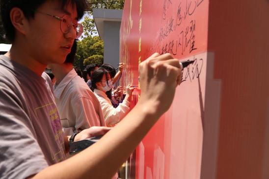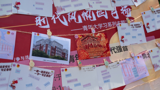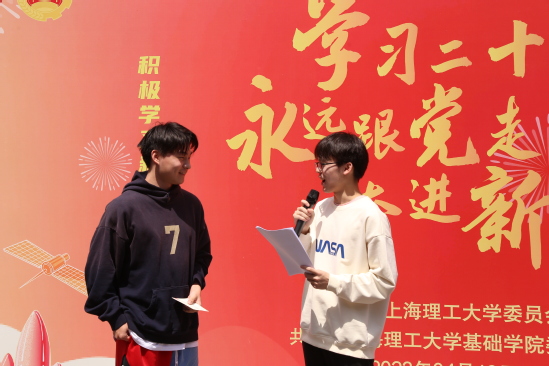 春风浩荡满目新,扬帆奋进正当时!4月10日中午,为学习贯彻习近平新时代中国特色社会主义思想和党的二十大精神,创新丰富“青年大学习”线下活动内容体系,由共青团上海理工大学委员会主办,基础学院团委承办的“青年大学习”线下主题活动在军工路1100号校区正式开展。本次活动形式多样,内容创新丰富,近千名学生参与其中。 “青年大学习”线下打卡学习 同学们在完成“青年大学习”线下打卡学习后可以在展板留言、合影留念。留言板设立在第四食堂门前,吸引了众多学生前来参与。红色的版面上坚挺有力的笔体书写着“学习二十大,永远跟党走,奋进新征程”,周围的空白部分被同学们对未来的美好畅想填满。活动结束后,“爱我中华”“星星之火,可以燎原”等寄托同学们美好祝愿的文字被记录在留言板上。日语2班的翟海琦同学表示:“学习新思想、争做新青年不只是口号,还应落实到行动,学习打卡和留言活动不仅让我们感受到良好的活动氛围,也是一次成功的思想教育实践,会更激励我们在未来的学习生活中踔厉奋发、勇毅前行。”