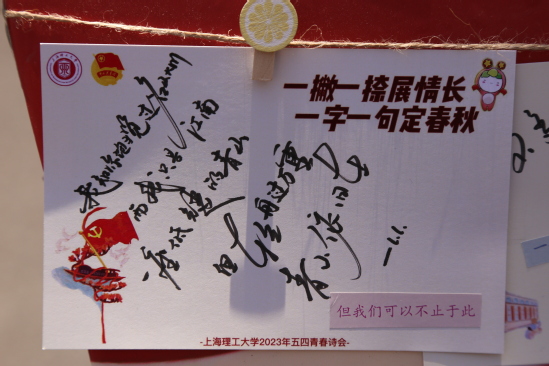 同学在留言板上留言 五四青春诗会,记录上理人的浪漫 拼贴诗活动旨在希望同学们在明信片上用简短的词句拼贴出心中美好,随心而动。该活动广受欢迎,前来参与的同学络绎不绝,大家围在桌前从众多的素材中选取心仪的词、句,用青春隽永的小诗表达内心的美好愿景。拼贴诗活动打破传统诗词创作形式,是一次丰富学生情感的创新实践。电信8班的郭宸希同学在活动结束后意犹未尽,她表示:“拼贴诗活动是反映青年学生内心的情感表达,充满浓厚的文艺色彩,也在不知不觉中传递积极向上的青年风貌。” 同学们制作的部分拼接诗 线上看团课,线下竞答题 线上观看主题团课,线下还能参与竞答兑换奖品。青年大学习知识竞赛的相关习题围绕党的二十大展开,充分结合相关时政内容,引导同学们进一步深入领会学习党的二十大精神。同学们以个人或小组为单位积极参与、踊跃报名,结合平时的学习积累和心得举手抢答。活动现场气氛紧张热烈。知识问答竞赛既是对平时学习的情况考察,也是提高青年知识储备、拓展时事视野的一项综合活动。智造8班的肖寒同学在活动结束后仍然兴奋不已,他表示竞赛活动更能激发同学们参与青年大学习活动的热情。