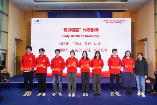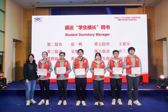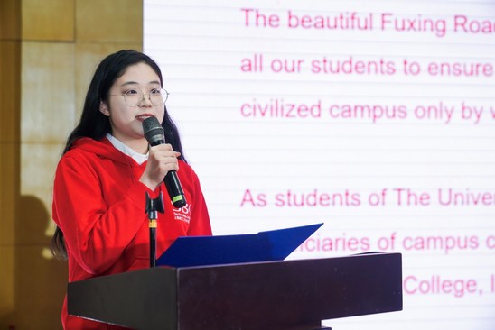 “复兴英华”获奖团队颁奖现场 创全有我·中英在行动 宿区与学生息息相关,2023 年中英国际学院在推进宿区文明建设方面积极行动,加强制度建设、日常管理和安全巡检。校区共选出了 6 位宿舍楼长,党员寝室集体挂牌,引领大家共同建设文明宿区。党员寝室代表黄婷发起了建设文明宿区的倡议书。她号召大家做好文明校园的倡导者和参与者,担当使命, 携手并肩,用实际行动打造有文化底蕴的文明校园。