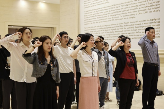 活动现场 随后,大家一同走进一大会址,在一件件珍贵展品前驻足,在一个个历史场景中思索,在庄严肃穆的氛围里感悟,零距离地感受了那段创业维艰、卓绝奋斗的岁月,感悟中国共产党人的初心和使命。 最后,预备党员面向党旗、举起右拳,在金晶的带领下宣誓,表达对党的忠诚以及为党和人民的事业奋斗终身的庄严承诺。 宣誓环节 本次主题党课让党员们通过走、听、看、学等方式沉浸式感受党史,点亮红色初心。同志们领略了相关人物事迹,真正了解这片土地上的红色基因和革命精神,深深感受到新时代中国青年身上的重任,无论过去、现在还是未来,中国青年始终是实现中华民族伟大复兴的先锋力量。 合影留念 通过沉浸式地行走红色复兴之路,预备党员在百年历史中追寻初心使命、寻找真理光芒、领悟力量源泉、感悟斗争精神,同志们纷纷表示将不断加强党性修养,坚定立场,时刻不忘党的宗旨,强化使命与担当,为实现中华民族伟大复兴而努力奋斗。