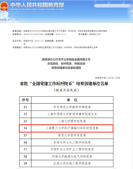首批“全国党建工作标杆院系”培育创建单位名单 学院坚持“面向人民生命健康”,积极开展大健康领域前沿科学研究,在上海市重点学科、一流学科、高原学科等的持续支持下,科技创新能力与产业服务水平全面提升,专业及平台建设也取得长足进步。近年来学院承担了100多项国家各类重要科研项目,获批经费超过1亿元;获得省部级以上科技奖励10余项,其中主持获得上海市技术发明一等奖1项、科技进步奖一等奖1项;发表SCI收录论文800余篇,授权发明专利近300项;完成高质量科研成果转化200多项,创造经济效益超百亿元。2022年新增国家级项目13项,牵头重点研发项目1项,横向千万级项目1项,技术成果转化项目千万级以上项目2项,高水平知识产权质与量持续提高。学院目前拥有三个国家级一流本科专业建设点(生物医学工程、食品科学与工程、医学影像技术)和一个上海市一流本科专业建设点(食品质量与安全);2022年食品科学与工程专业通过中国工程教育认证。 学院根据三全育人工作要求深入推进教育教学综合改革,为健康产业发展培养高素质人才。由我院教师季云峰、王刚等指导,王泰淇、胡晓屹、毛越等学生组成的科创团队研制完成的项目《吉尼斯世界记录保持者“小丘”——全球首款可产业化的乒乓球机器人》获得第八届中国国际“互联网+”大学生创新创业大赛金奖、第十三届“挑战杯”大学生创新创业大赛国赛银奖,2022Robocom机器人开发者大赛国赛一等奖等多项赛事国家级奖项。结合新时代人才培养发展要求,学院创新大学生教育载体,组建“医创未来—医疗器械中国说”和“我们的美好‘食’代—食品健康中国说”大学生讲师团,引导学生将爱国情、强国志、报国行融入新时代的追梦征程之中。
